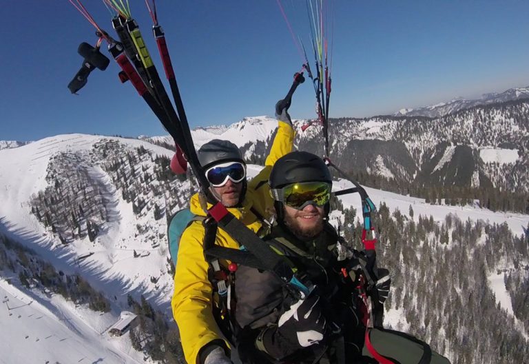 Schnee bedeckte Gipfel, klare Winterluft und eine Aussicht, die dein Herz höherschlagen lässt: Erlebe ein Paragliding-Abenteuer, das deinen Winterurlaub unvergesslich macht.