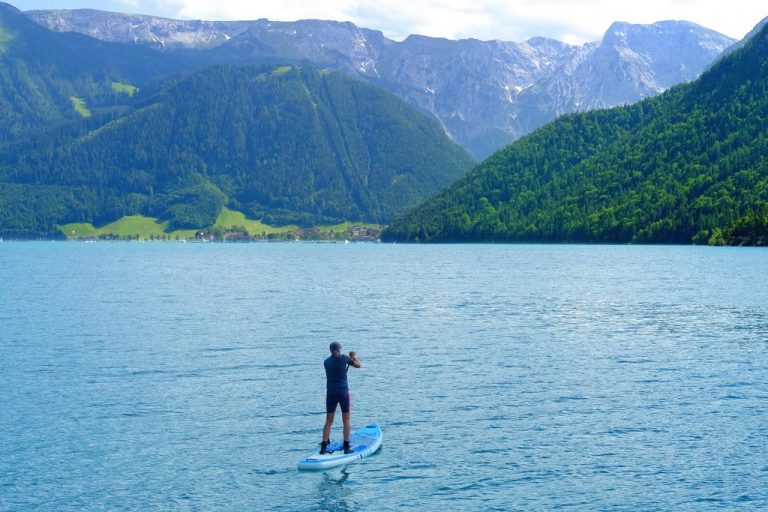 Beginne deinen Tag mit einem unvergesslichen Erlebnis auf dem Achensee. Noch bevor der See erwacht, gleitest du auf dem SUP-Board über spiegelglattes Wasser – begleitet vom Licht der aufgehenden Sonne.